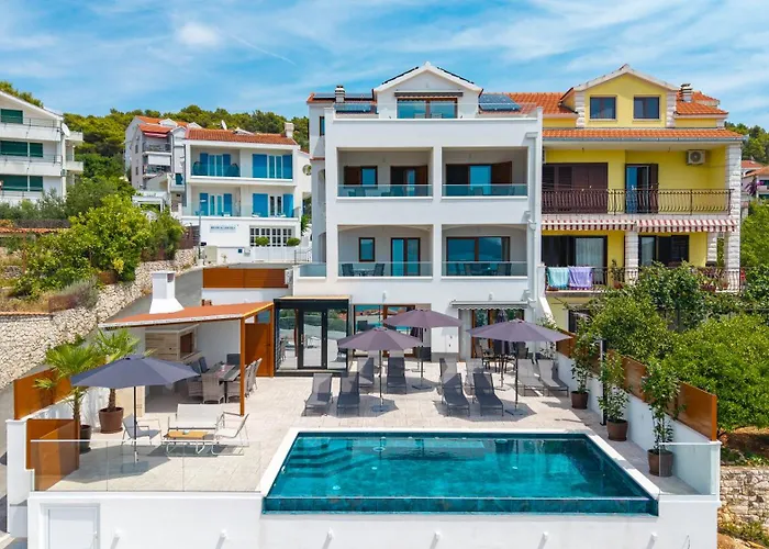 Die am Strand 7-Zimmer-Villa Paladium Trogir bietet einen Blick aufs Meer und liegt 20 Minuten Fußweg von der Weltkulturerbestätte Trogir entfernt WLAN steht den Gästen für ihre geschäftlichen oder privaten Zwecke zur Verfügung.
